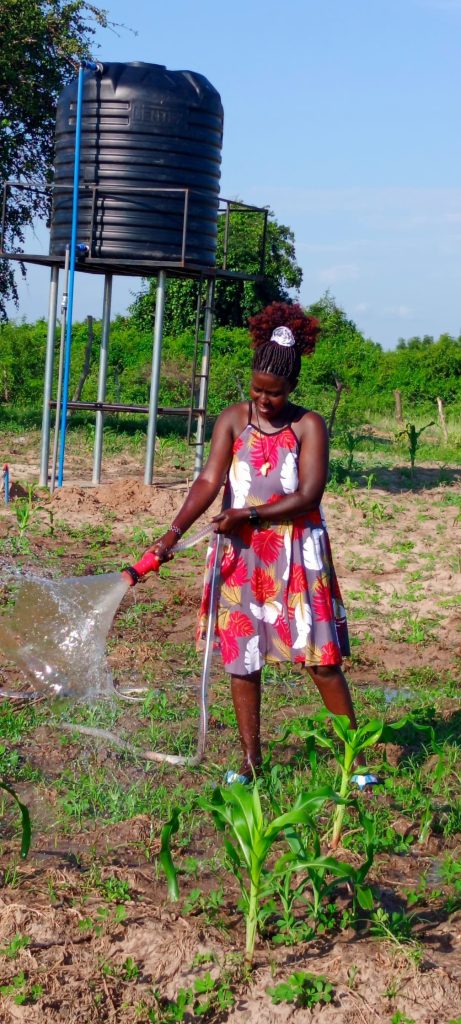 Irrigation at work giving life to the garden, ensuring healthy crops and food for tomorrow. Juliet Zalwango spraying water to the crops in the demonstration garden at CSLC