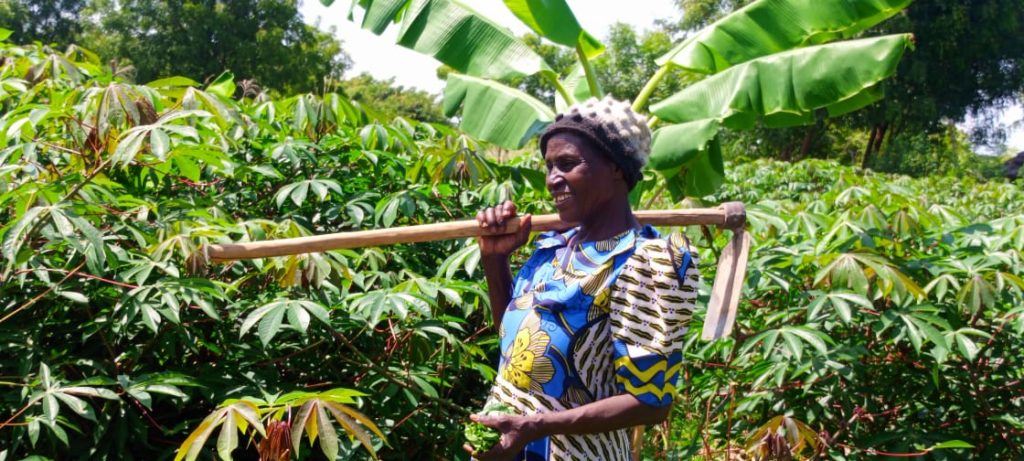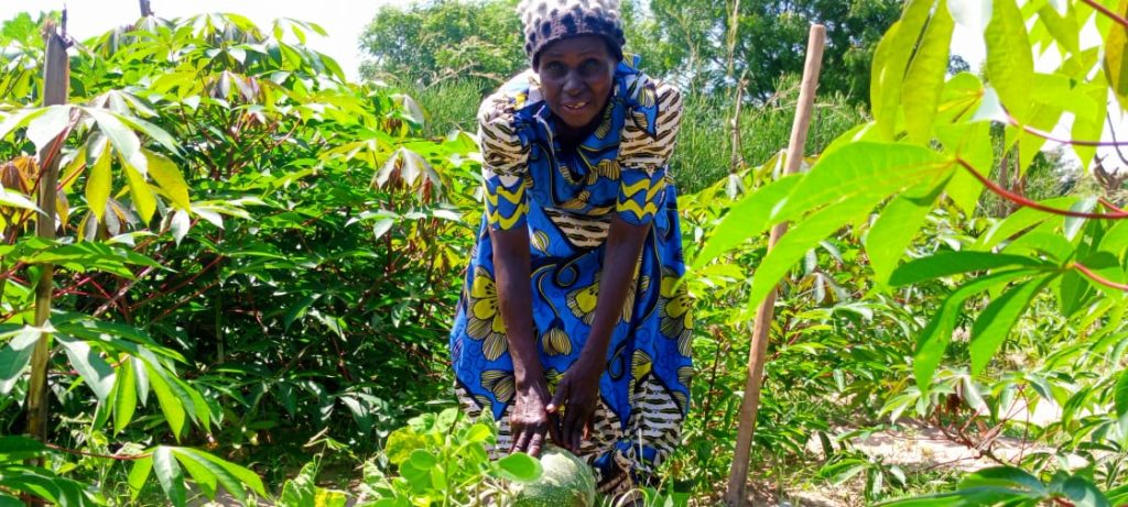 Figure 2: Bitamale smiles as she picks vegetables in her garden of cassava intercropped with banana and vegetables